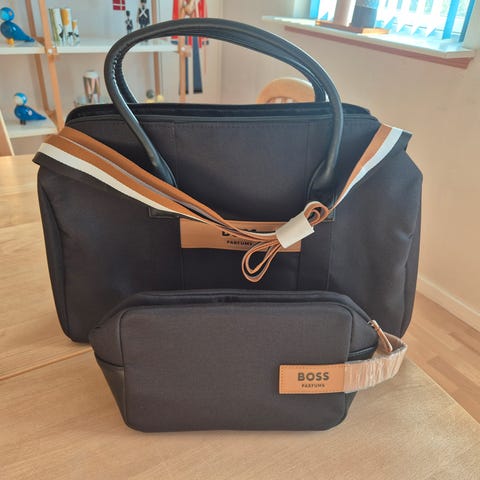 Hugo Boss toilettaske i sort stof med beige håndtag. Designet til mænd, egnet til opbevaring af toiletartikler og små personlige genstande.
