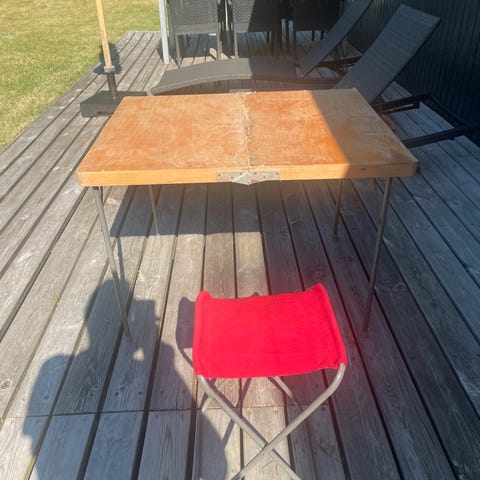 Retro camping-sæt. Sammenklappeligt bord med tilhørende sammenklappelig stol med rød sæde, opbevaret i en trækuffert. Bordet kan foldes sammen og opbevares kompakt sammen med stolen. Materialer inkluderer træ til bordpladen og metalramme til stolen. Designet til nem transport og opbevaring.