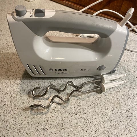 Bosch ClassicMix håndmixer med en effekt på 350 W. Farven er hvid. Leveres med flere tilbehør til forskellige piskefunktioner.