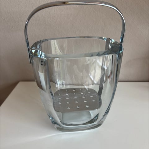 Isspand med hank, det svenske mærke strømbergshyttan er graveret i bunden. Der mangler is tang. Indsatsen er intakt, men desværre er der slået en lille flig af glasset hvor indsatsen sidder fast så den glider lidt ned og derfor fremstår defekt. Måske nogen vil forsøge at reparerer den eller måske kan indsatsen bruges. Byd gerne. Sendes gerne på købers regning, men glasset er tungt så det koster en del. Kan evt også bruges uden indsats.