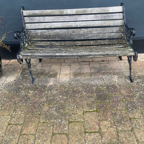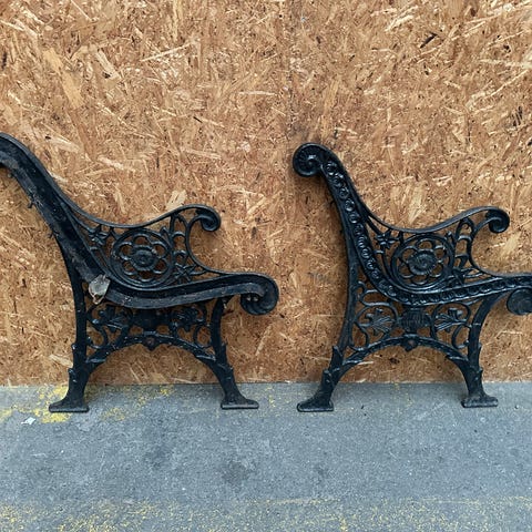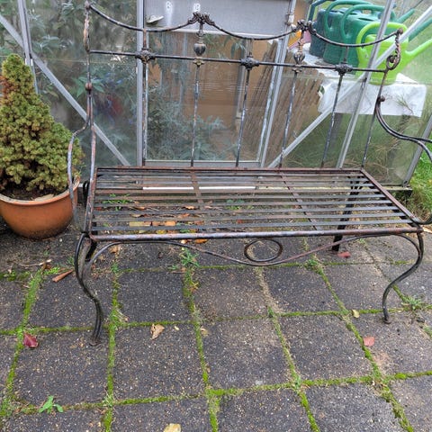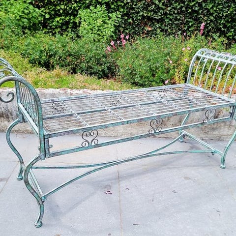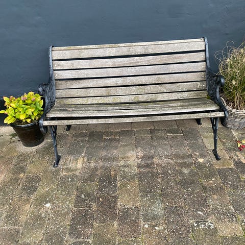 Smuk gammel jernbænk. Træet er udskiftet med Douglas gran og behandlet med træolie.