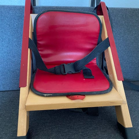 Stokke børnestol designet til børn. Fremstillet i træ med en rød polstret siddeplads. Stolens konstruktion og materialer er velegnede til brug som børnemøbel.
