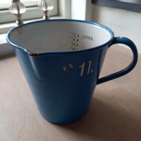 Madam Blå original fra Glud og Marstrand. målebæger i blå emalje med indvendige måleangivelser op til 1 liter. Køkkenudstyr til måling af væsker og ingredienser. Materialet er emalje, og designet inkluderer en hank for nem håndtering.