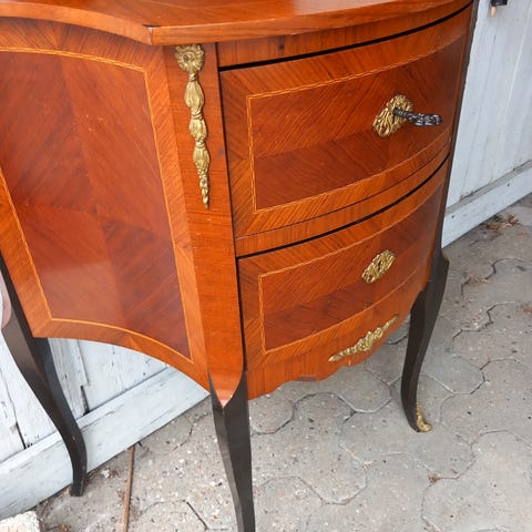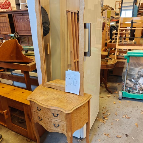 Lille entresæt bestående af kommode og spejl. Uden slag, ridser eller formørkning af spejlglas. Sættet er ca 50 cm i bredden, kommoden ca 60 cm høj, og spejlet 80 cm højt. Sælges kun samlet.