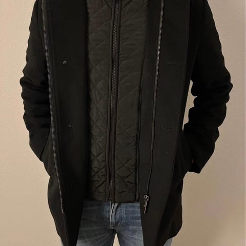 SAND Copenhagen frakke i størrelse 48 til mænd. Frakken er grå og lavet af en blanding af 85% uld og 15% kashmir. Inderlægget består af polyester og viskose. Materialet kombinerer varme og komfort, egnet til udendørs brug i køligere vejr.