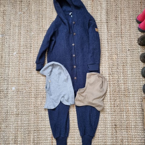 Sovedragt af 95% Merinould fra mikk-line. Utrolig lækker for barnet at have på under flyverdragt og/eller til en lur i barnevognen. Varm og blød og med ‘luffer’ til både fødder og hænder, der gør at barnet er pakket helt ind i én enkelt dragt. Kan samtidig også åbnes helt op, så barnet kan vokse og bevæge sig rundt i den efter behov. Vi har ikke brugt den særlig længe, da vores pige voksede ud af den, men uld bliver hurtigt lidt nusset. Kvaliteten er den samme, så håber andre kan få glæde af den.