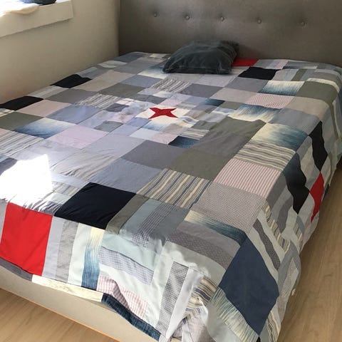 Stort, lækkert, vendbart patchwork- sengetæppe i skønne farver sælges.