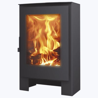 Heta brændeovn fremstillet i sort stål. Brændeovnen har en front med glaslåge og en ovnrum til brænde.