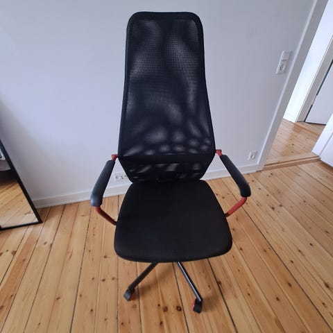 Ukendt designer samt mærke. Computer/Gamerstol til teenageværelset med sort og blå polstring. Stolen har justerbare armlæn og hjul for mobilitet. Materialerne omfatter syntetisk læder og plastik. Designet til brug ved computeren. Stolen er i pæn stand.