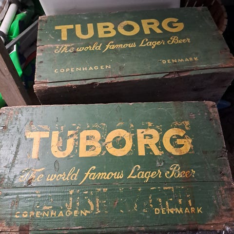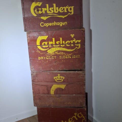 13 blåmalede og 6 hvidmalede ølkasser sælges