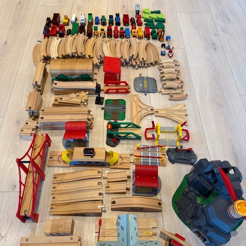 BRIO Togbane sæt i træ bestående af flere skinner, tog, vogne, broer og tilbehør. Sættet indeholder forskellige farvede tog og vogne, broer, tunneller og andre elementer til at bygge. Funktionelt og i pæn stand. Sidste billede er ikke originalt brio, men følger med hvis det ønskes.