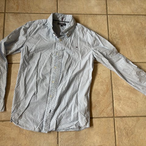 Tommy Hilfiger skjorte til dreng i størrelse 176. Skjorten er blå og lavet af bomuld. Den har knapper foran og et mønster med små blå detaljer. Perfekt skjorte til konfirmation eller anden festlig lejlighed. Som ny.