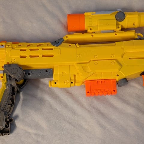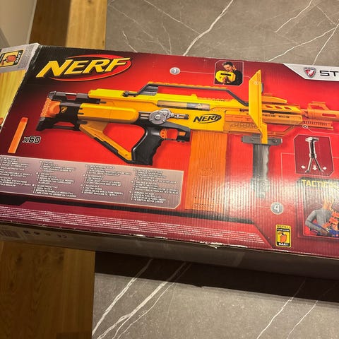Nerf N-Strike Elite børne legetøjsgevær i orange farve. Fremstillet til børn som en del af Nerf legetøjsserien. Designet til leg og udendørs aktiviteter.