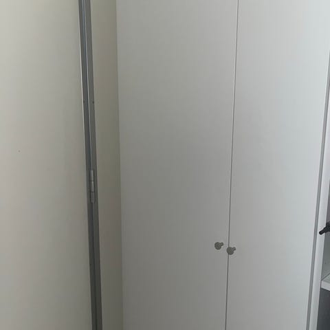 Brugt PAX skab, uden låger. Huller for ledninger i bagbeklædning og skruehuller på den ene side. Inklusive 2 trådkurve, 3 hylder og bøjlestang.