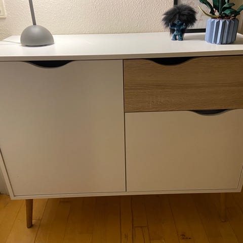 Har en plet i det ene skab. Eller meget fin. Lavet et hul til ledninger bag den ene skuffe bag på.