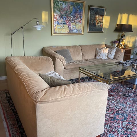 Gruppen ( 3 + 2 ) har vendbare hynder monteret med Alcantara type stof , og dette skal udskiftes på et tidspunkt , men gruppen kan bruges som den er ! Stellet er i fremragende stand og fremtræder i ualmindelig flot kosmetisk stand , meget smuk Mahony / Palis bejdse ! Gruppen sælges ( pga flytning ) kun samlet for kr 1.500 og bedes afhentet