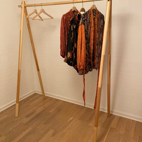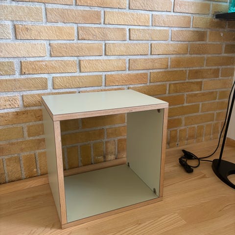 Reolen har 12 hylder, der kan tages af og sættes på, som man lyster. Vi har både brugt den til opbevaring og som stående skrivebordsstation.