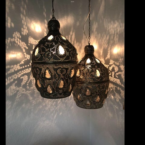 Flot og charmerende marokkansk lampe/pendel. Lampeskærmens hullede mønster giver hyggelig belysning. Mål: Diameter 20 cm. Højde 98 cm.