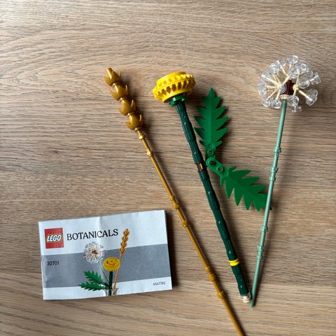 LEGO Botanical Collection blomster sæt med detaljerede blomster i forskellige farver. Sættet indeholder elementer til at bygge realistiske blomster med stilke, velegnet til dekoration eller samling.