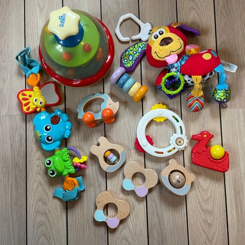 Fisher-Price børnelegetøj bestående af en rød brandbil med stige, et rødt tog med forskellige knapper og et aktivitetslegetøj med figurer og former i flere farver. Legetøjet er designet til små børn og fremmer motoriske færdigheder og leg.