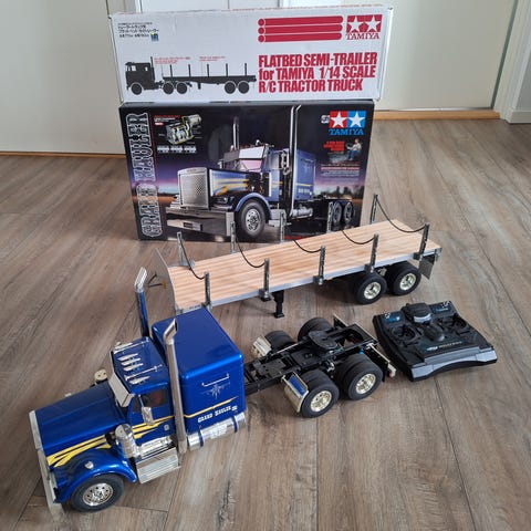 Tamiya 56302 Semi Trailer med Tamiya 56502 lystæt. Traileren har aldrig kørt og fremstår derfor som ny.