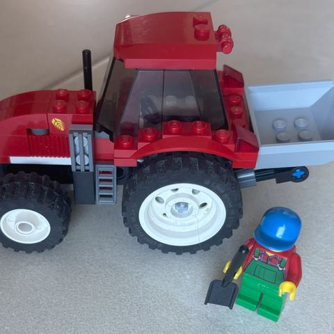 LEGO City Traktor legetøj med rød traktor, en figur og tilbehør som kasse med grøntsager. Sættet indeholder byggeklodser til samling af traktor og tilbehør. Ingen kasse