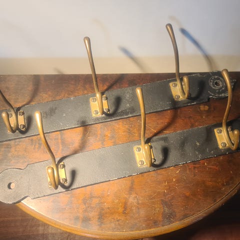 Gammel (antik?) knage, hatteholder, frakkeholdet - trearmet i messing med sorte knopper i plast.