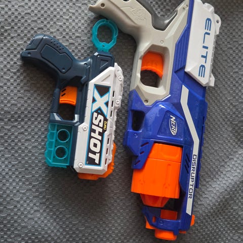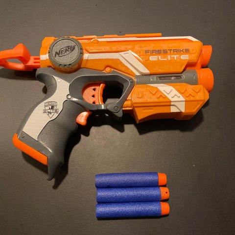 Nerf Elite dart pistol i orange og sort farve. Legetøjsvåben designet til børn, fremstillet i plastmateriale. Egnet til leg og dartskydning.
