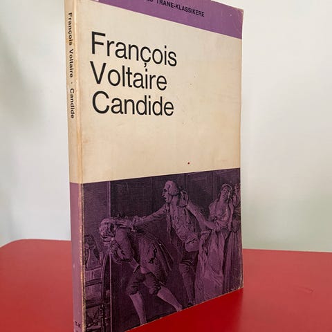 Voltaire Drømmerier bog med tekst på dansk. Indeholder klassiske værker og udgivet af Gyldendal. Bogens omslag er grøn og har sort-hvid illustration på forsiden.