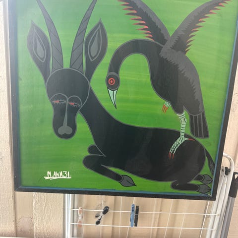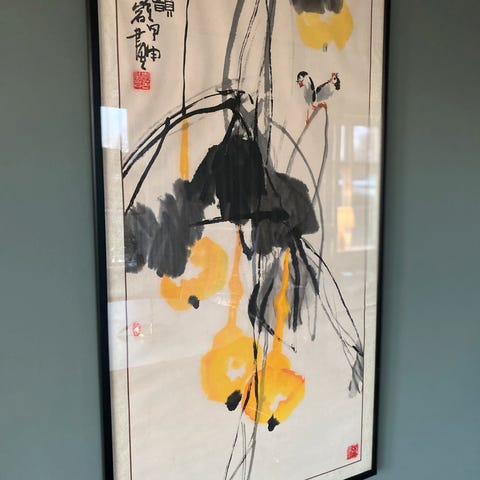 Abby Shan. Sorte fuglei ekspressiv stil. Olie på lærred. Ydre rammemål. 108x88 cm. Lille revne på ca 1 cm. i lærred.