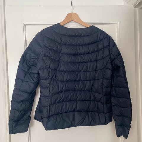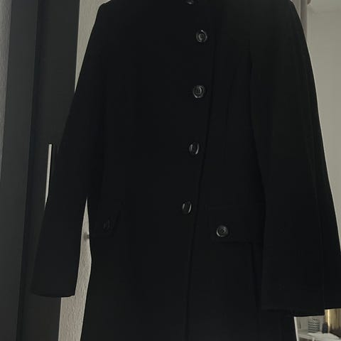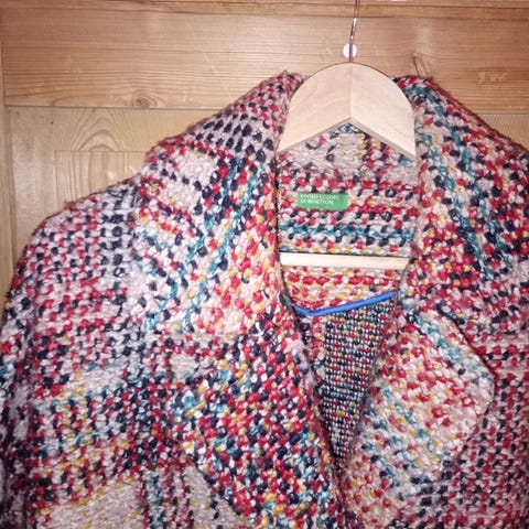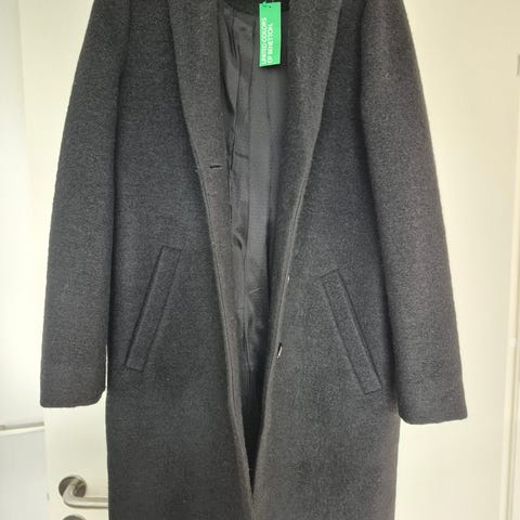 Benetton frakke i uldmateriale, blå farve, størrelse M til kvinder. Jakken har en dobbeltradet knaplukning og en stor krave. Den er velegnet til køligere vejr og har et klassisk design.