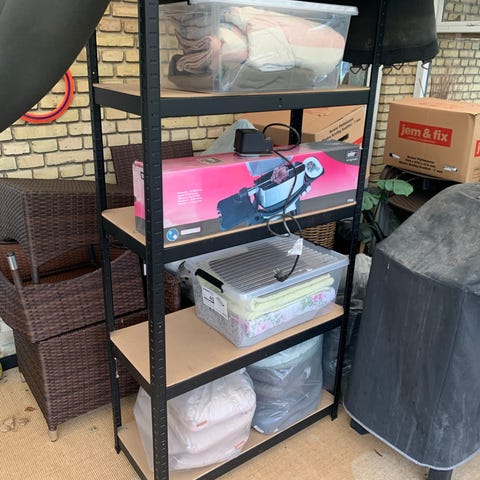 Reol i metal med flere hylder. Egnet til opbevaring af forskellige genstande. Kan bruges i garage, værksted eller lignende miljøer. Reolen har en robust konstruktion og flere opbevaringsniveauer.