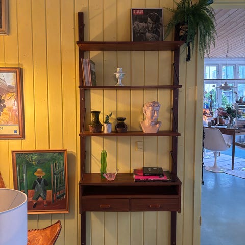 Ældre hyldesystem med 4 hylder, 2 vanger og messing beslag.