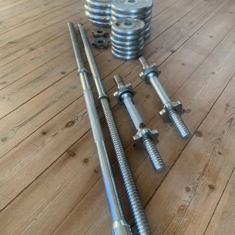 Træningssæt bestående af vægtskiver, håndtag og låsemøtrikker. Sættet kan bruges til styrketræning og består af flere vægtskiver, der kan monteres på håndtagene for justerbar belastning.