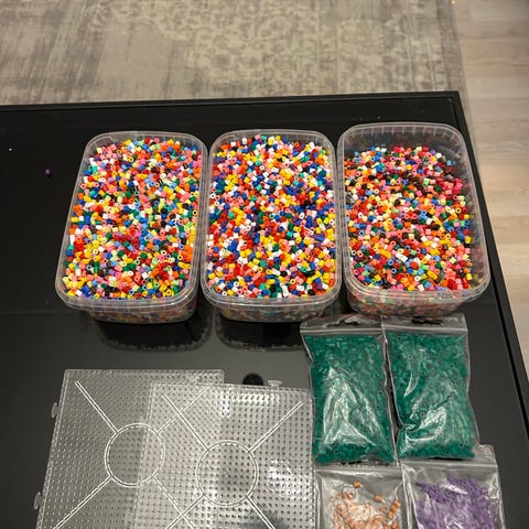 Hama Perler sorteringskasse med flere rum til opbevaring af perler i forskellige farver. Indeholder perler i farver som gul, sort, lyserød, lilla, blå, rød, hvid og turkis. Kassen er praktisk til organisering af perler til kreative hobbyprojekter.
