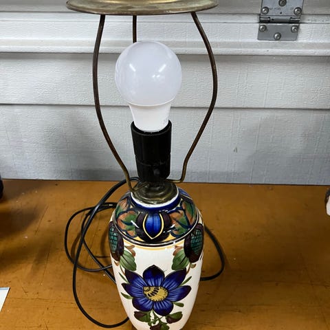 Aluminiavase 1270/394 lavet om til bordlampe med ledningsudtag gennem messingtop. Ny el. Afbryder på ledning. Uregelmæssighed i glasuren ved standflade. Glasurskrab på den ene side. Se fotos. H29 cm inkl fatning. Sælges uden skærm. Du kan loppesjoppe den for 280 kr.
