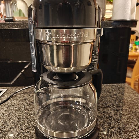 Sort KitchenAid kaffemaskine med glaskande med kapacitet på 1,25 liter. Knapper til indstilling af tid og brygning. Har permanent filter til kaffebønner. Er brugt færre end 20 gange.