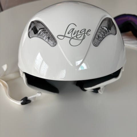 Skihjelm i hvid farve med justerbar rem og polstret indvendig for komfort og sikkerhed.