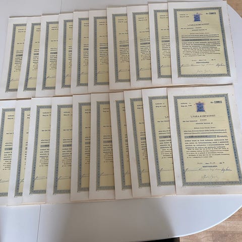 Sæt af antikke aktiecertifikater indrammet i trærammer. Certifikaterne viser forskellige selskaber og har historisk værdi. Rammerne er nye i klassisk trædesign og passer til vægophæng. 2 svenske aktier, 4 amerikanske og 1 dansk.