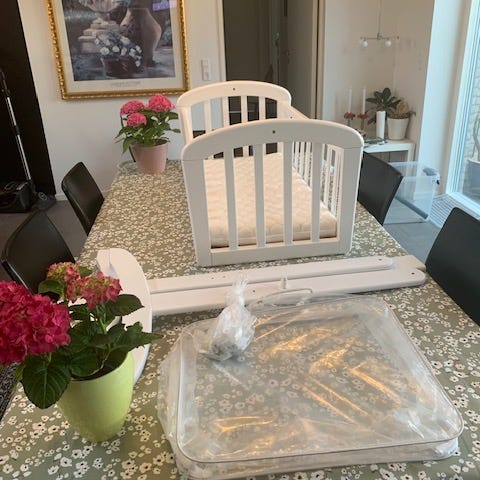Tremmeseng med vuggefunktion og BabyDan madras.