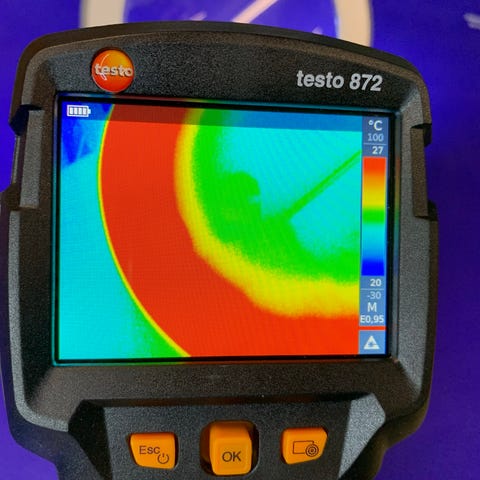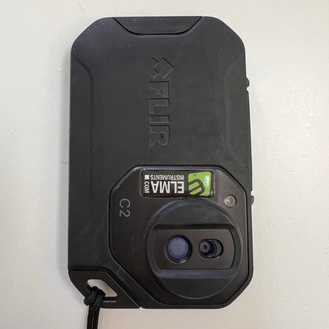 Testo termisk billedkamera til fotoudstyr. Enheden er designet til at måle og visualisere temperaturforskelle ved hjælp af termisk billedteknologi. Kameraet har en håndholdt formfaktor med en sort og orange farve og leveres med tilbehør som kabler og opbevaringskasse.