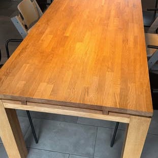 Solidt og gedigent spisebord med to tillægsplader på hver 50 cm. 100 x 200-300 x 75 cm. Har mindre brugsspor, som kan fjernes ved sæbebehandling eller let slibning.