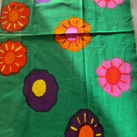 Marimekko Unikko stof med karakteristisk blomsterprint i blå, lilla og grønne farver.