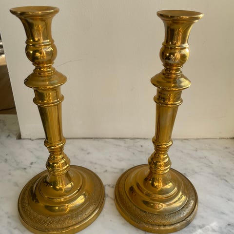 2 messing lysestager med facetslebne glas, der er en lille flig på det ene glas