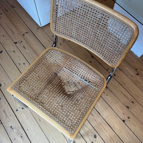 Lignende frisvinger stol med hul i det flettede sæde. Hullet kan dækkes med en pude, som jeg selv har brugt – det har fungeret fint. Stolen er stadig brugbar.