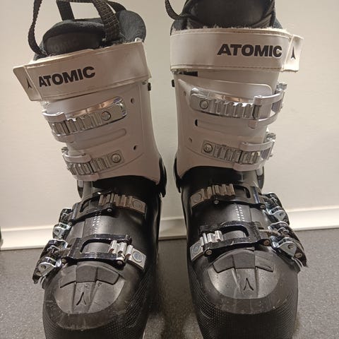 Atomic Hawx Ultra skistøvler i størrelse 24-24,5. Farven er sort, og støvlerne har flere spænder til justering. Designet til skiløb med robust ydersål og polstret inderside for komfort. Narrowfit, som gør at de er extra gode til at navigerer på skiene
