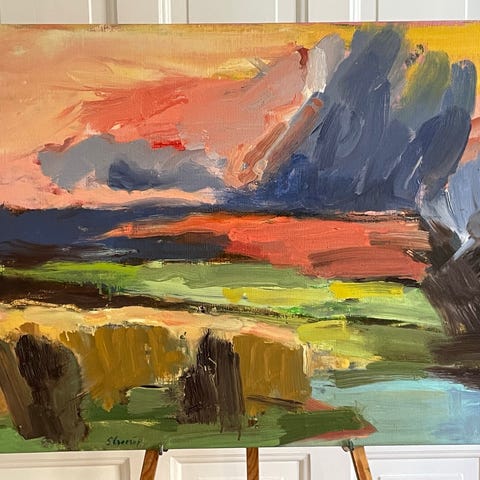 Maleri af et landskab med et gult træ i forgrunden og havet i baggrunden. Maleriet har en ekspressiv og farverig stil med tydelige penselstrøg. Farverne domineres af blå, gul og grøn.