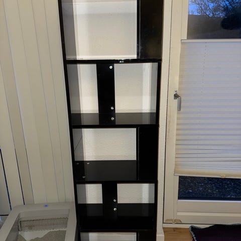 Bogreolen, som gør det nemmere for børnene selv at vælge og se sine bøger. Den er kun blevet brugt i kort tid (2 hylder mangler at blive monteret) og sælges pga. pladsmangel.