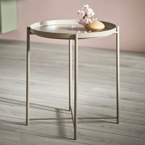 Minimalistisk sidebord/ bakkebord. Bakken er aftagelige og kan også bruges til servering. Bordet måler 84 i diameteren.