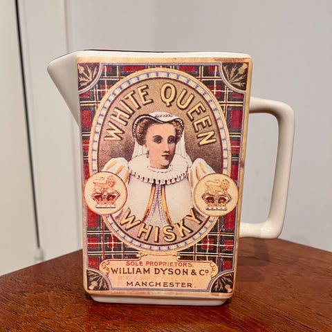 Royal Salute 21 års whisky flaske i blå keramik med dekorativt mønster og metal låg. Flasken er designet til at fejre dronning Elizabeths kroning og er et samlerobjekt.